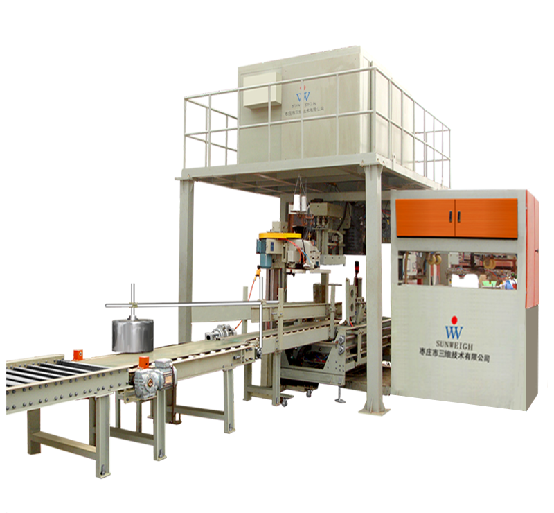 粉劑全自動包裝機型號SW-ABF-800,該款全自動包裝機主要有自動上袋機構(gòu)、稱重機構(gòu)、送料機構(gòu)、機體框架、控制系統(tǒng)、除塵單元、技術(shù)檢測單元、折邊縫包機構(gòu)、輸出機構(gòu)等組成。自動上袋機構(gòu)自動將包裝袋碼齊,通過觸手吸盤將包裝袋拾起移動到上袋機構(gòu)處,上下吸盤將包裝袋打開,上袋機械手將包裝袋夾住,移動機械臂將包裝袋自動套在下料口處,檢測裝置檢測到包裝袋,夾袋夾自動將包裝袋夾緊,稱重機構(gòu)通過PLC控制系統(tǒng)在接收到套袋完成信息后,自動將稱量好的物料填充到包裝袋內(nèi),送料機構(gòu)繼續(xù)對稱量機構(gòu)送料,同時金屬檢測機構(gòu)檢測物料中是否存在金屬物質(zhì),根據(jù)檢測的結(jié)果決定是否執(zhí)行下一個包裝環(huán)節(jié),有則自動剔除,沒有則等待完成下一批次的包裝??刂葡到y(tǒng)在接收到物料填充完畢后,等待除塵機構(gòu)將在包裝過程中造成的粉塵處理掉后,發(fā)出信號,夾袋夾將包裝袋放下,抱袋小車將包裝袋移動到折邊機處進行折邊作業(yè),同時縫包機將折好邊的包裝袋自動縫包斷線,完成包裝環(huán)節(jié)。輸送機將包裝好的包裝袋輸送到拍打機構(gòu)自動對包裝袋進行整袋作業(yè),等待最后的碼垛作業(yè)。