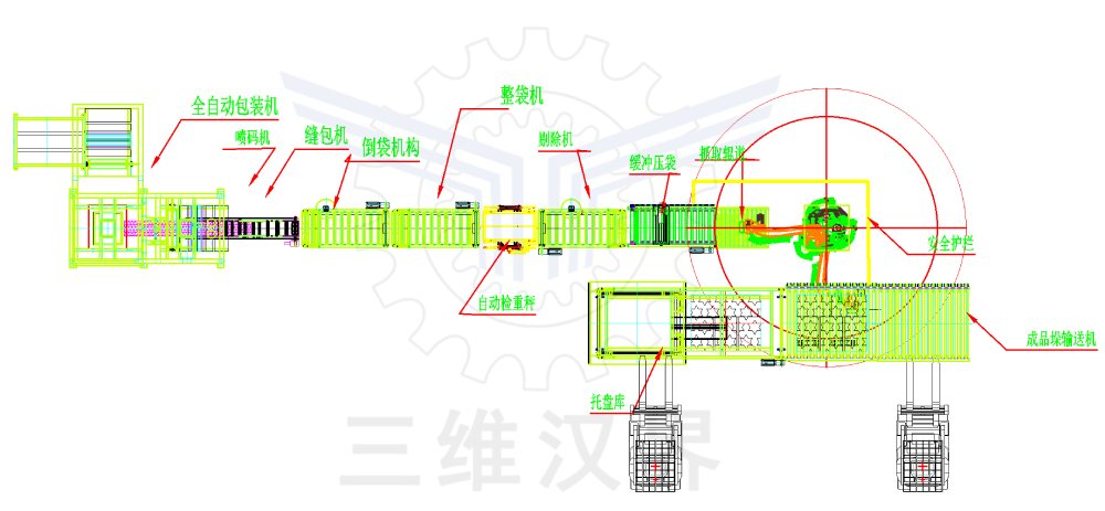 硫銨從烘干床下料口落入輸送帶輸送到包裝機(jī)料倉(cāng),自動(dòng)下料、稱(chēng)重、取袋套袋、裝料、縫包后,整形并輸送給碼垛機(jī)器人,機(jī)器人碼垛、托盤(pán)庫(kù)自動(dòng)供給空托盤(pán)、滿(mǎn)垛輸送機(jī)輸送、托盤(pán)全自動(dòng)裝車(chē)機(jī)裝車(chē)或轉(zhuǎn)運(yùn)到倉(cāng)庫(kù)既定位置整齊擺放。